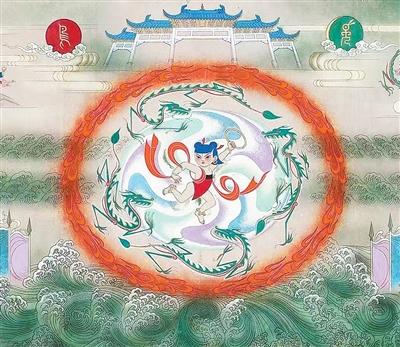 图为张仃设计的壁画《哪吒闹海》局部画稿。