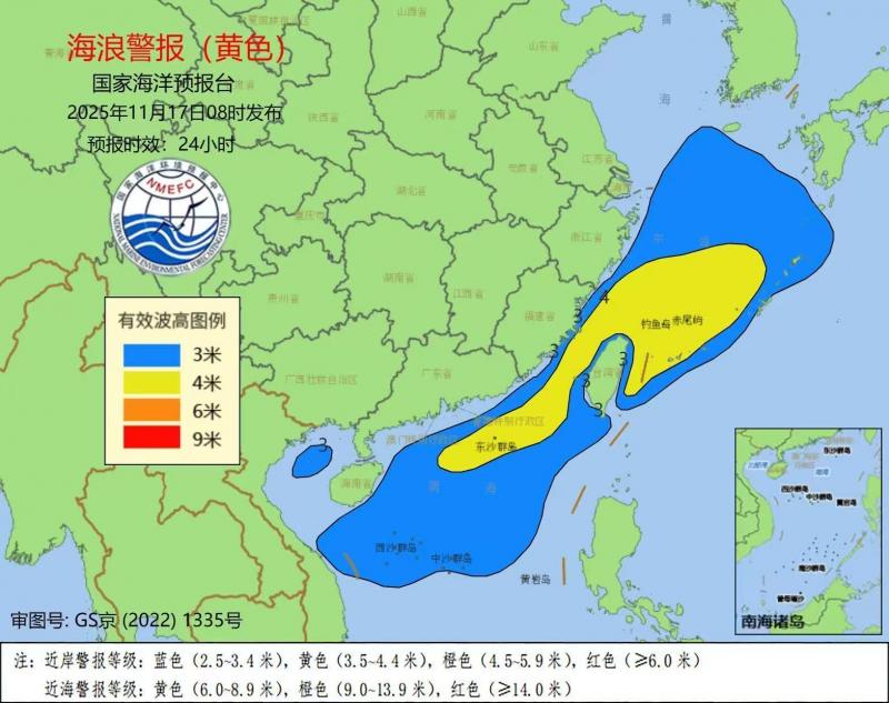 记者从自然资源部获悉,国家海洋预报台今天(17日)8时发布海浪黄色警报:受强冷空气的影响,预计11月17日下午到18日上午,东海南部、台湾海峡、南海北部、中部、北部湾将出现3到5米的大浪到巨浪区;福建近岸海域将出现3到3.8米的大浪,该近岸海域海浪预警级别为黄色,上海、浙江、海南东部近岸海域将出现2到3.4米的中浪到大浪,该近岸海域海浪预警级别为蓝色。请在上述海域作业的船只注意安全,沿海各有关单位提前采取防浪避浪措施。