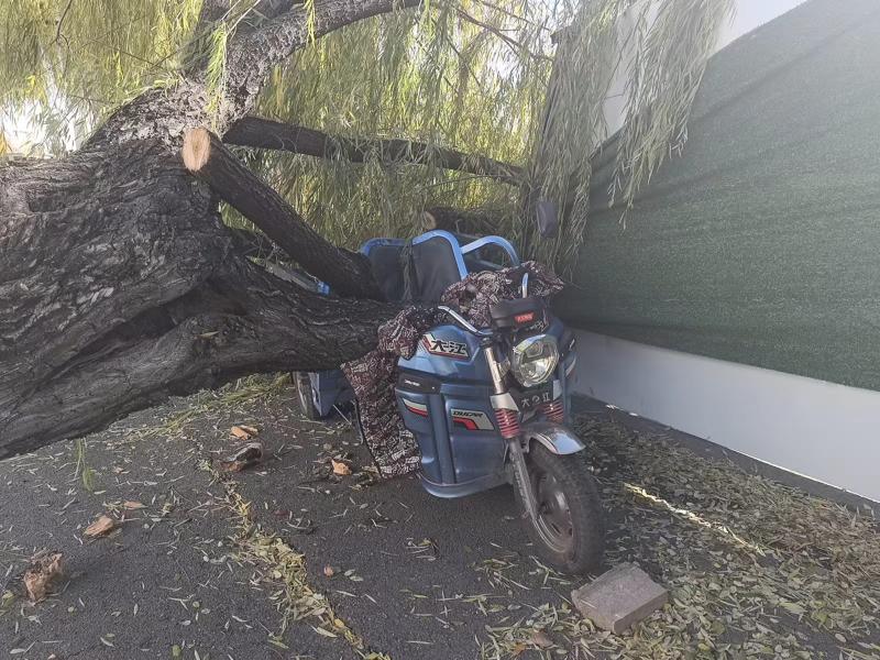 不到十分钟,救援人员抵达现场,只见一棵直径约60厘米的柳树被大风连根拔起,树干横卧在人行道一侧,一辆电动三轮车被压在树干中段,被砸伤的男子意识清醒,右手臂被粗壮的树干死死压住,无法动弹,脸上因疼痛和紧张布满了汗珠。