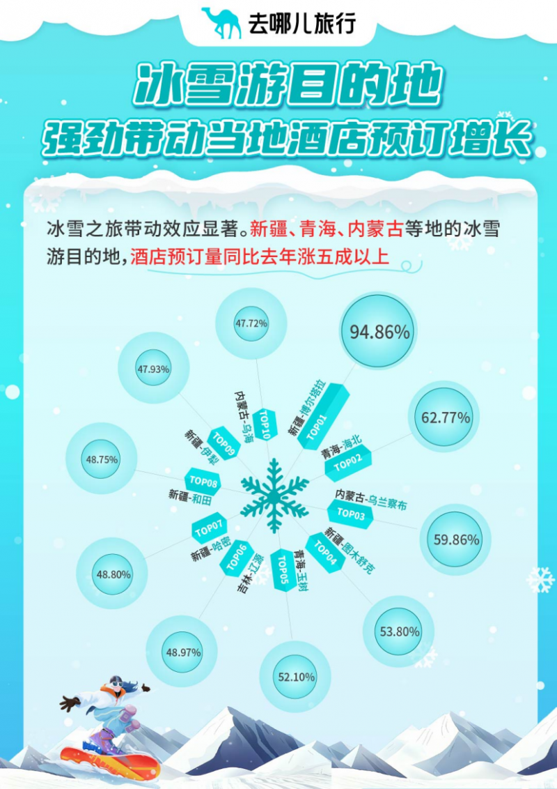 去哪儿旅行数据显示,全国雪场的“开板大战”已经开启,多地滑雪场所在地区酒店预订量环比增长五到七成。此外,越来越多的外国人也喜欢飞来中国“过冬”。即日起到春节前,使用非中国护照预订国内航班的机票量同比增长13.58%,覆盖101个城市。传统冰雪游目的地哈尔滨、大连、长春均跻身入境热门目的地,新疆伊宁的入境游机票订单同比增70%。