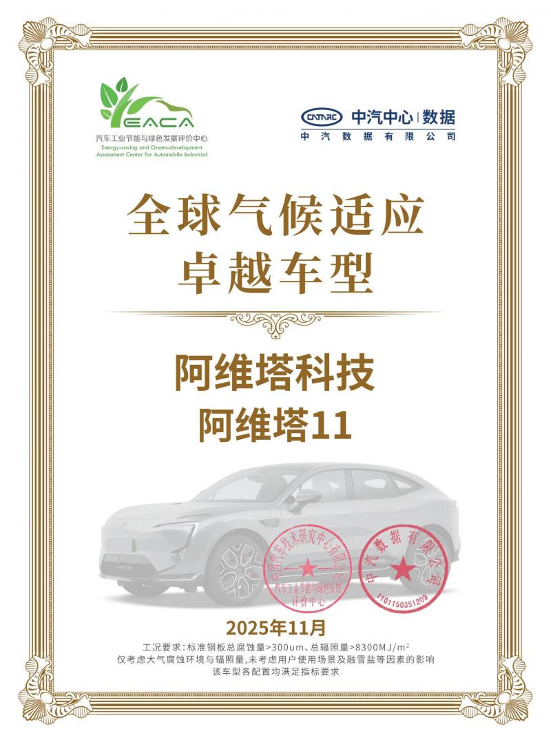 近日,阿维塔11荣获中国消费品质量安全促进会颁发的“全球气候适应卓越车型”称号,成为了全球首款获得该称号的中型SUV。这一荣誉不仅标志着阿维塔11的耐腐蚀性能获得行业权威认可,更为阿维塔加速拓展海外市场、打造全球新豪华智能电动汽车领导品牌提供了坚实的品质基石。