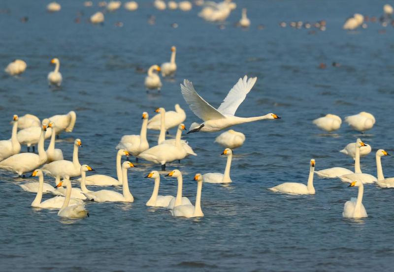 经过统计,目前官厅水库区域有大天鹅200多只,小天鹅400多只,今年秋季至今共有5万多只迁徙候鸟在这里临时降落。