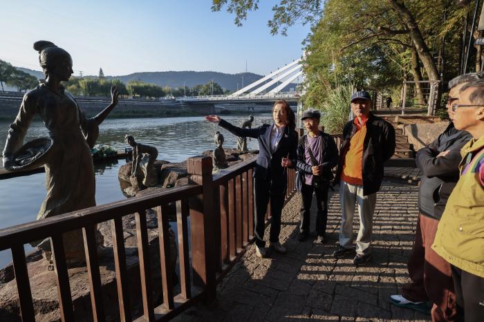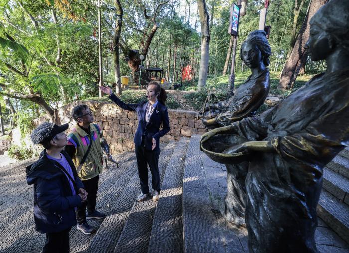 诸暨市以全方位导游技能培训为基石、以本地金牌导游选拔为抓手,为游客提供兼具深度与温度的融合体验服务,助力诸暨文旅经济高质量发展。11月20日,在诸暨西施故里景区,参加今年金牌导游选拔的年轻导游(左)在给游客们讲述西施的故事。