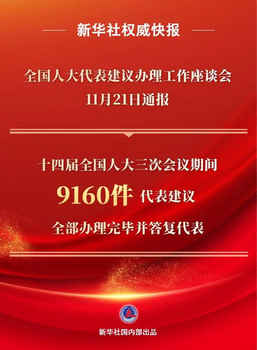 记者从11月21日在京举行的全国人大代表建议办理工作座谈会上获悉,今年3月十四届全国人大三次会议期间,代表们依照法定程序提出对各方面工作的建议9160件。经逐件研究分析,交由211家承办单位研究办理,目前已全部如期办理完毕并答复代表。