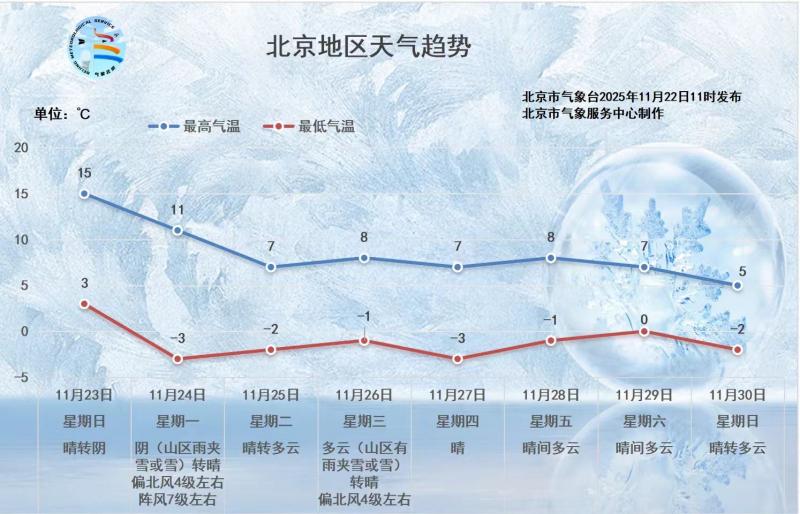 明天白天天空云量有所增多,最高气温在15℃左右,是出行的好天气。不过,明天夜间开始天气转阴,后半夜北风逐渐加大,冷空气又来影响京城了。受冷空气影响,下周初期风冷模式和晴冷模式隔天切换,气温正式进入10℃以下。下周一(11月24日)北风将持续输出,中午前后到傍晚阵风强劲,平均风力在四级左右,阵风七级左右,山区还会有雨夹雪或雪,对大家周一交通出行有不利影响,请提前做好出行计划,注意防风防寒。