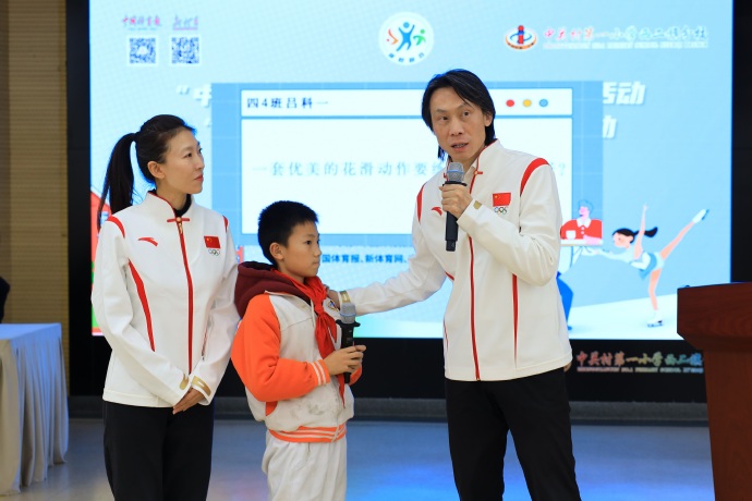 11月22日,“中华体育精神大讲堂”校园宣讲活动、“冠军体育课”运动员进校园活动走进中关村第一小学西二旗分校。花样滑冰世界冠军庞清/佟健用并肩追梦的奋斗故事生动诠释了中华体育精神,鼓励同学们勇敢去尝试、去拼搏。