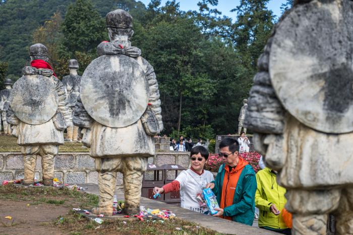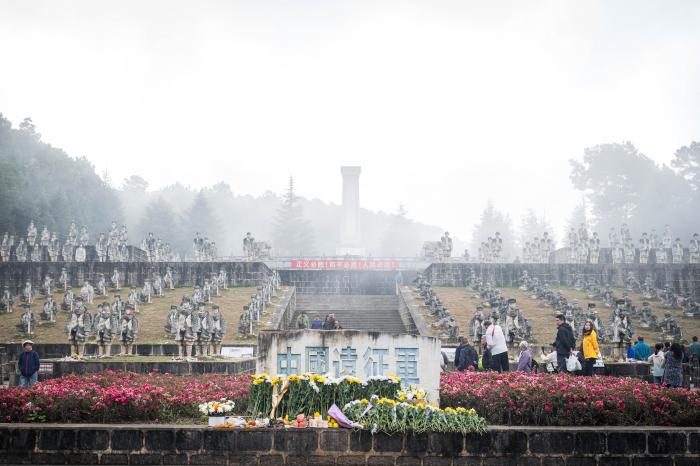 11月20日,游客在云南省保山市龙陵县松山战役旧址参观时向娃娃兵雕像敬献糖果。