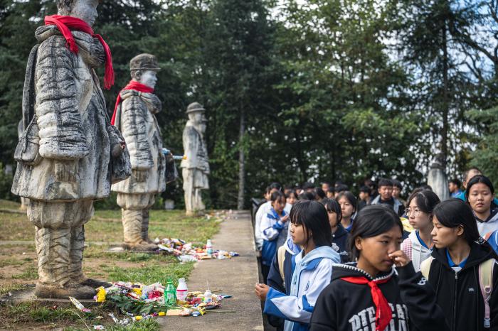 11月20日,芒宽民族中学学生在云南省保山市龙陵县松山战役旧址参观娃娃兵雕像。