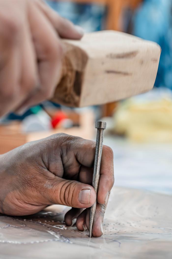 白族扎染作为大理地区传统手工印染工艺,距今已有上千年历史。白族扎染技艺传承人段袁在周城村“璞真染坊”制作扎染模板(11月21日摄)。