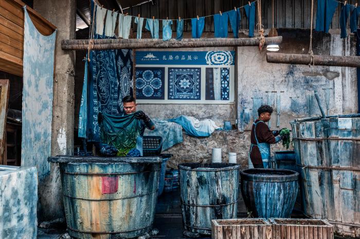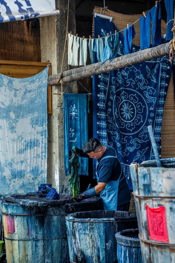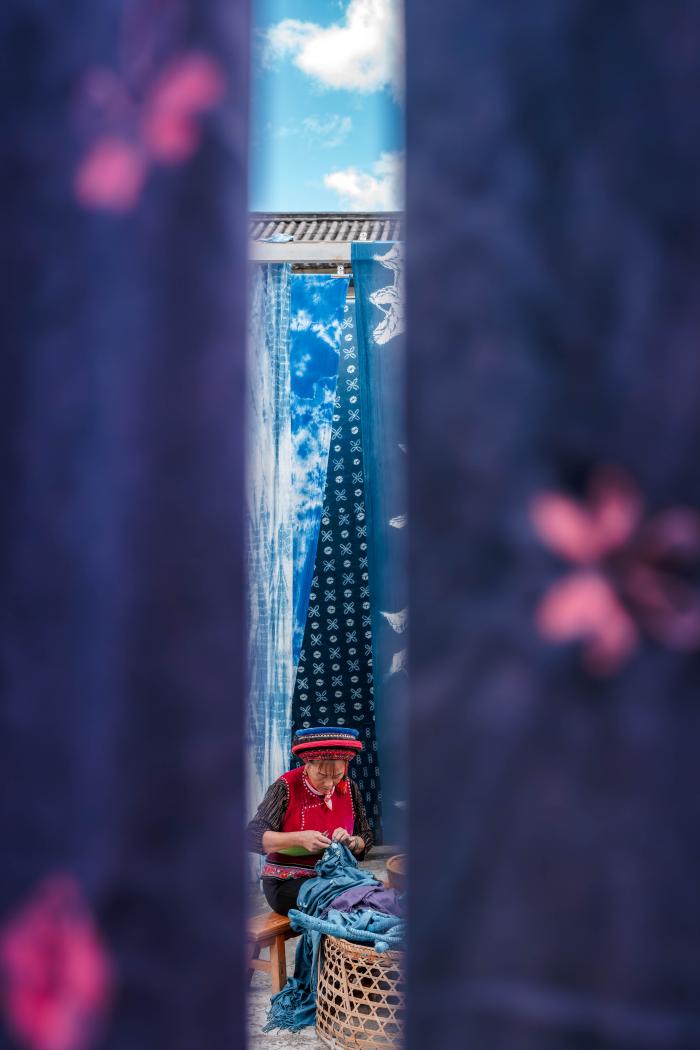 白族扎染以板蓝根为主要染料,工序包含绘图、制版、印花、扎花、染色、漂洗、拆花、晾晒等。其中,扎花、浸染为核心步骤,手工艺人执针走线,在布料上扎出不同类型的图案,再用植物染料染出蓝底白花、生灵百态。2006年,白族扎染被列入第一批国家级非物质文化遗产名录。白族扎染技艺传承人段银妹在周城村“璞真染坊”印花(11月21日摄)。