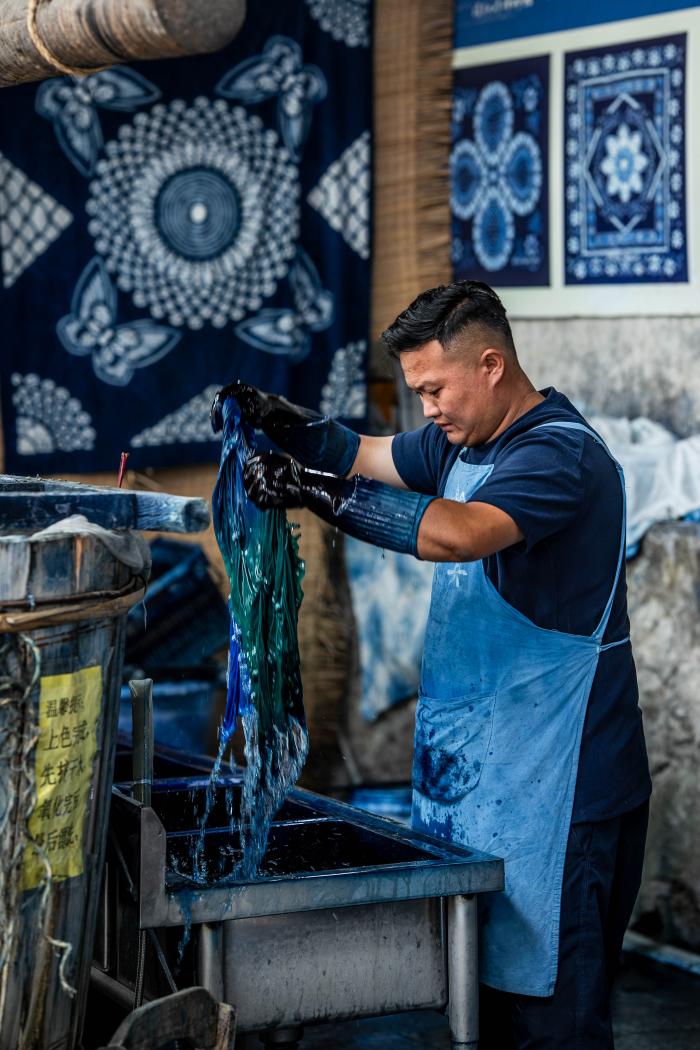 白族扎染技艺传承人段袁在周城村“璞真染坊”将缝扎好的布料放入染缸内浸染(11月21日摄)。