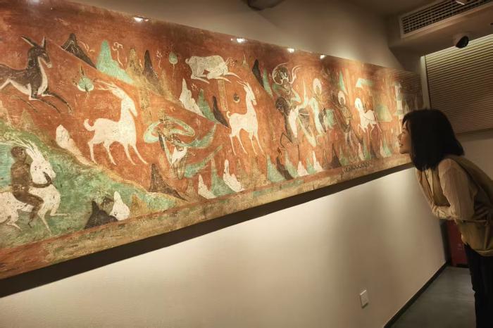 缓步上二楼,一场与千年前文化对话的“重彩金线·胡同回响——敦煌到法海寺的千年壁痕”壁画艺术特展正在展出。