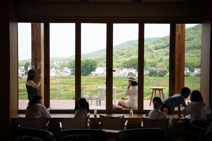 2025年7月26日,在安徽省合肥市庐江县长冲村,游客在万山电影公园的山谷茶室内休闲。新华社记者 张端 摄