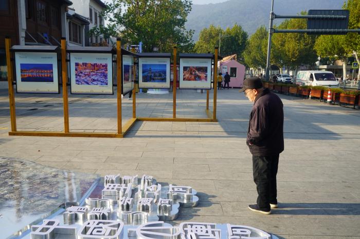 11月23日,一位老人在第二届大运河文化摄影展现场驻足参观。