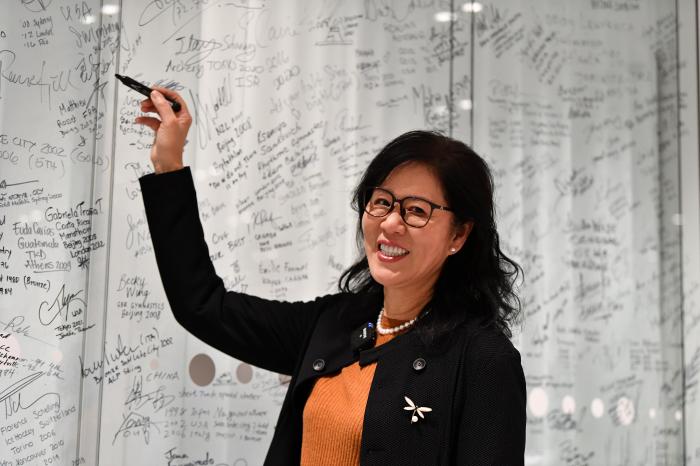 11月24日,郎平颁奖仪式后在签名墙上签名。