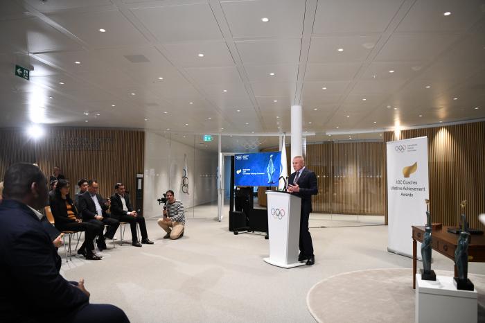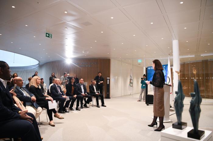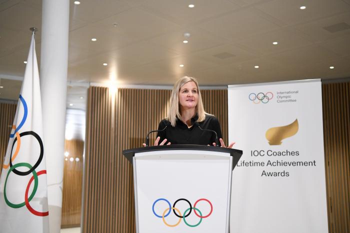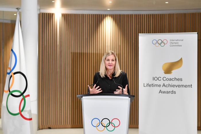 11月24日,国际奥委会主席考文垂在2025年度国际奥委会教练员终身成就奖颁奖仪式上致辞。