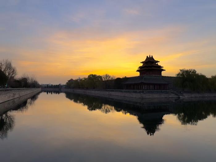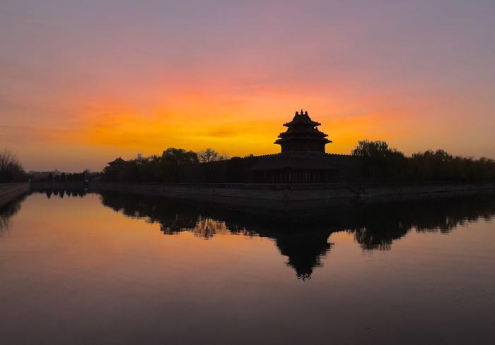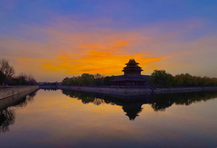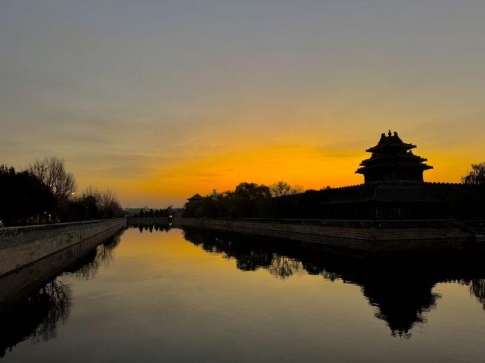 飞檐翘角与熔金霞光在筒子河上投下镜像。