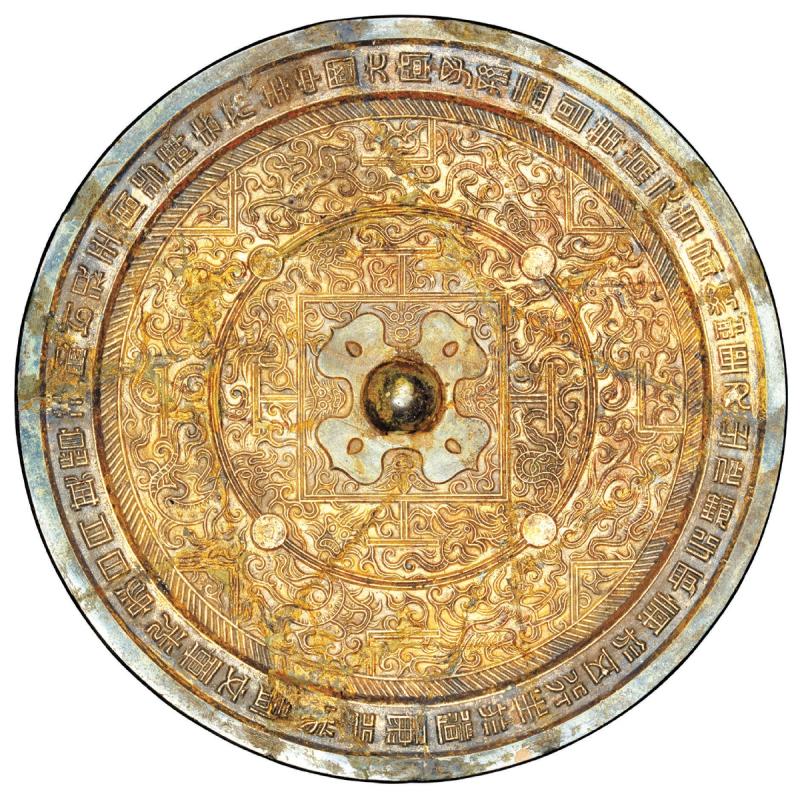 展览中出土于湖南长沙伍家岭211号墓的“中国大宁”瑞兽博局纹鎏金铜镜(西汉),正是这种范例的典型。