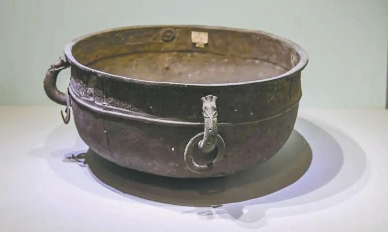 展览起始位置陈列了一件战国时期的蟠螭纹青铜鉴。展介中写道:“据推测,人们将水注入鉴内后,可以用平静的水面自视。”展出的铜鉴颈部微敛,弧腹,圈足。外壁饰三周蟠螭纹带,纹带间和圈足上各有一道绳纹,近口处有兽首形环耳。