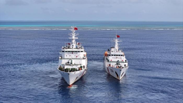 11月8日,中国海警舰艇在黄岩岛海域执行常态化巡航任务(无人机照片)。新华社记者 贝赫 摄