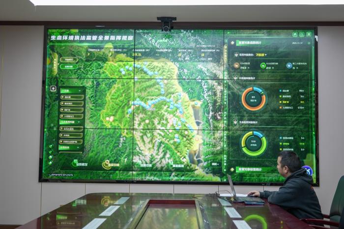 在九寨沟县生态环境局,工作人员在查看生态环境执法监管全景指挥平台(2025年11月17日摄)。新华社发(欧阳慧摄)