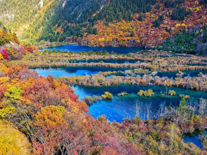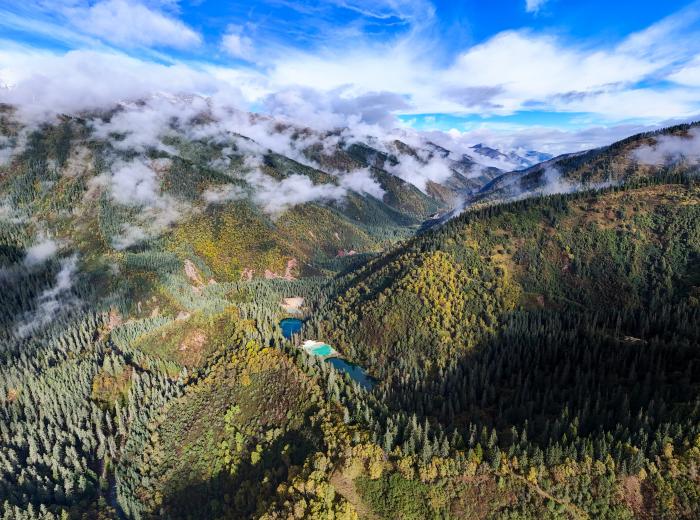 九寨沟,蜚声中外的世界自然遗产。鲜为人知的是,它位于人口仅6.7万的同名高原小县境内。这是2024年10月12日拍摄的九寨沟县神仙池景区内的高原湖泊和钙化池(无人机照片)。新华社记者 王曦 摄