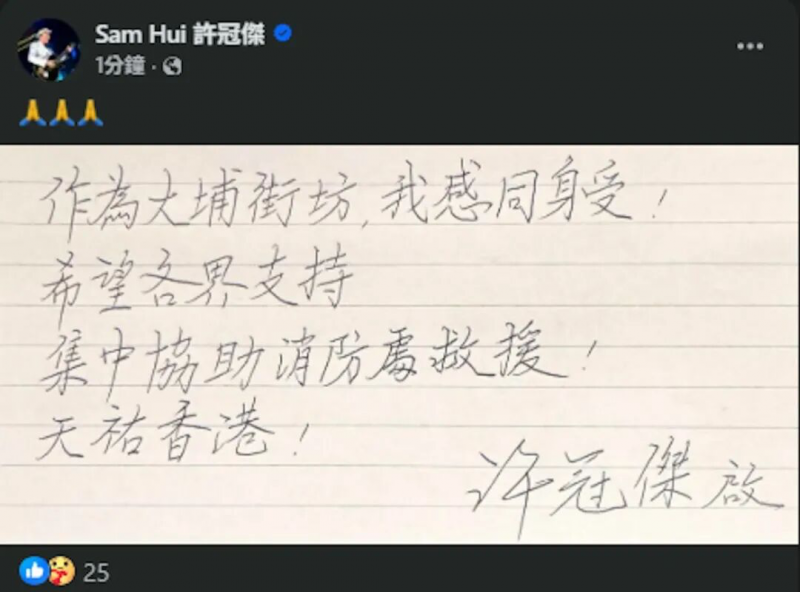 作为“大埔街坊”的许冠杰以亲笔字留言:“我感同身受,希望各界支持集中协助消防处救援,天佑香港!”质朴的言语引发广泛共鸣。谢霆锋、佘诗曼、陈伟霆、钟欣潼、容祖儿、林晓峰等艺人集体转发灾情相关信息,祈祷“愿平安”。