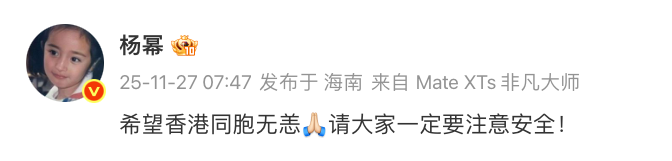演员杨幂除了暂缓代言计划,还发文叮嘱:“希望香港同胞无恙,请大家一定要注意安全!”易烊千玺工作室宣布暂缓《礐峃2025(Live)》专辑宣推及相关活动,以低调姿态回应灾情。檀健次通过团队表达对灾区同胞的祝愿,直言“希望平安渡过难关”。田曦薇主演的古装剧《嫁金钗》官方宣布延迟宣传行程,片方表示将密切关注灾情动态调整后续安排;《梓渝的唱游地图・常州站》相关内容也确认延期。