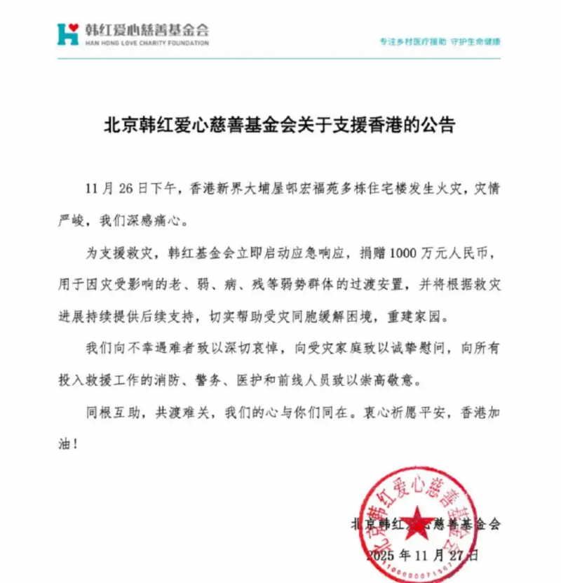 另一边,捐款驰援行动也迅速落地,韩红第一时间转发北京韩红爱心慈善基金会公告,宣布捐赠1000万元人民币支援香港,专项用于弱势群体过渡安置及后续救援;歌手周深通过上海复星公益基金会捐赠100万元人民币,致敬一线救援人员,助力紧急救援与家园重建工作。