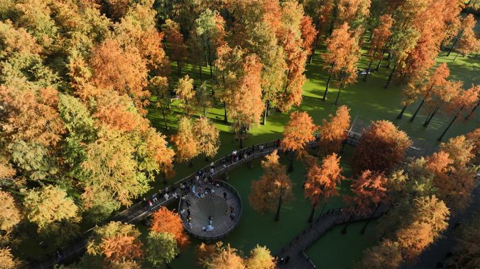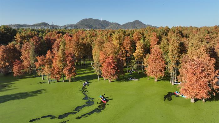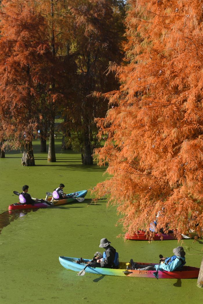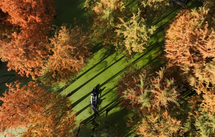 随着气温降低,浙江省杭州市青山湖的近百亩池杉、落羽杉披上色彩斑斓的“衣装”,和水面碧绿的浮萍相映成景。