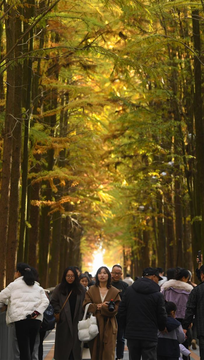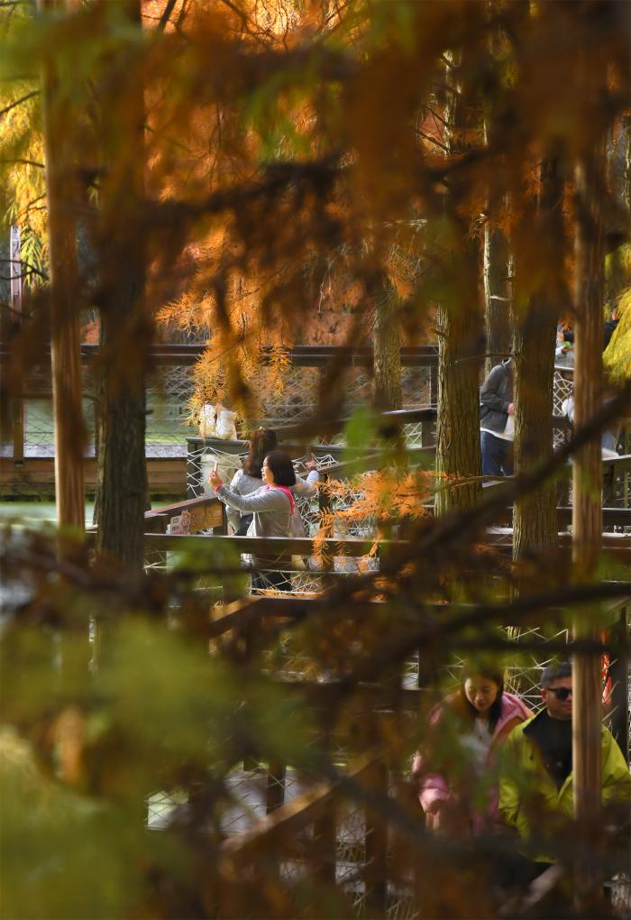 11月28日,游客在青山湖“水上森林”的木栈道上观光。