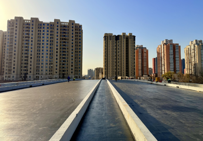 11月28日,北青报记者在施工现场看到,这座双向四车道的桥梁已经架设完成,桥面已完成防水作业施工,两侧预留了隔声屏的位置。桥南北两头 的路面上,工人们正驾驶着压路机来回压路。桥头南侧紧邻的就是居民区。面对工期紧、居民区近的问题,项目团队创新采用了“预制+架设”模式,在工厂提前完成箱梁预制生产,再运至现场安装。