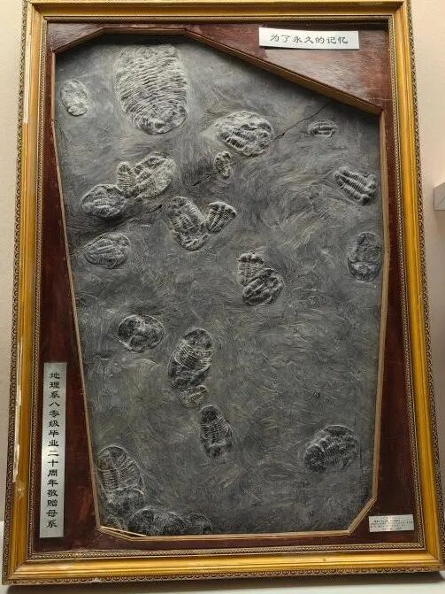 1980级地理系学生捐赠了一块三叶虫化石版。这版化石来自湘西,记录了地球上寒武纪生命大爆发不久的生物图景,具有极高的科学价值。