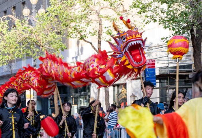 3月7日,美国加利福尼亚州旧金山举行农历新年花车巡游。巡游队伍沿途进行管乐演奏、舞龙舞狮、民族歌舞、武术杂技等表演,吸引数以万计的民众前来观看。