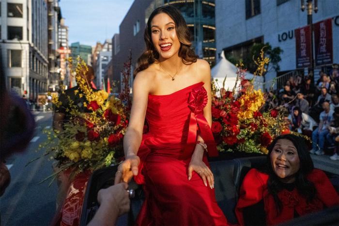 3月7日,米兰冬奥会女子自由式滑雪金牌得主谷爱凌在美国旧金山参加中国农历新年花车巡游活动。新华社发(董旭东摄)