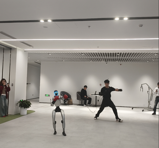从现场演示可以看到,工作人员穿戴着一套全身惯性动作捕捉系统,正控制机器人以自身的结构和运动能力模仿完成人类的全身动作。当工作人员做出挥手走动、半蹲、转身等动作时,机器人也同步复刻相应动作。