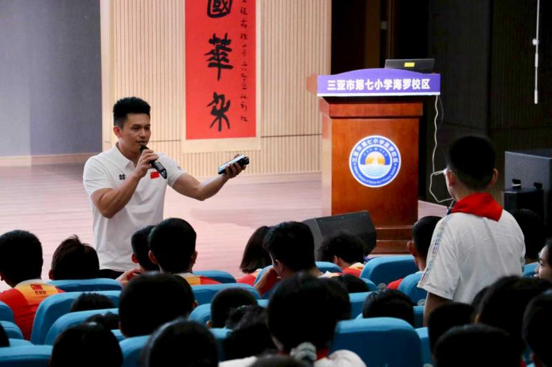 4月21日,三亚亚沙会开幕前一天,“中华体育精神大讲堂”校园宣讲活动、“冠军体育课”运动员进校园活动走进三亚市第七小学(海罗校区)。国家攀岩队速度组主教练钟齐鑫、攀岩世界杯冠军周娅菲等国家攀岩队20余人到场,用岩壁上的成长故事,在青少年心中种下“勇于挑战、攀登向上”的种子。