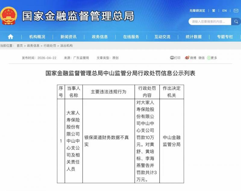 4月22日,国家金融监督管理总局中山监管分局发布的行政处罚信息公示显示,大家人寿保险股份有限公司中山中心支公司及相关责任人员因银保渠道财务数据不真实违法违规行为被依法处罚。