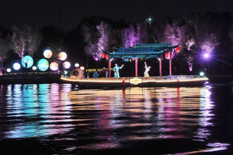 19点25分,搭载超大落地窗的游船从运河西码头缓缓驶离,航行途中,沿岸风光尽收眼底。船内大屏幕从大运河千年历史娓娓道来,游客可一边聆听运河故事,一边感受光影交织下的现代运河景致。行至中途,游船天窗缓缓开启,灯光亮起之际,河岸舞台映入眼帘,伴随着阵阵浑厚的漕粮号子,身着古装的演员仿佛穿越千年时光,向游客生动再现通州码头昔日漕粮运输的繁盛景象。随着游船行进,一艘艘伴行的小船变身舞台,舞蹈演员们长袖翩翩,舞姿曼妙,与观众近距离互动。