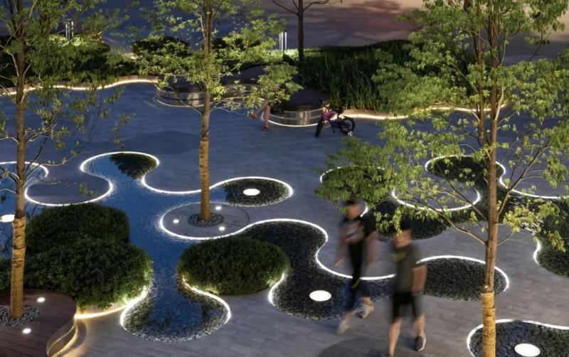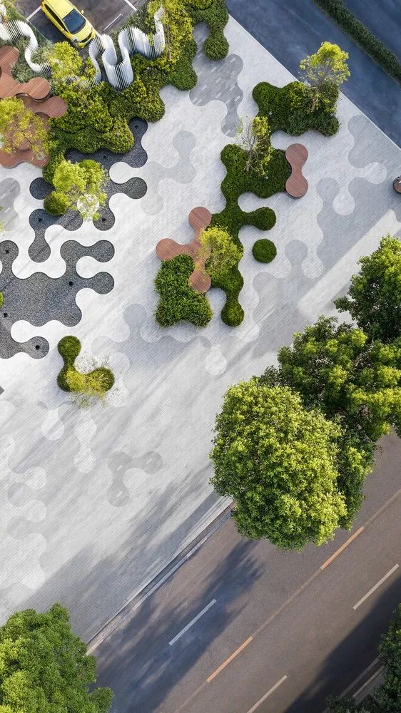为体现其理念,园区以圆形为设计基础做出衍生的形态特征展现了其特有的“社区”氛围,做到了有序与无序的平衡;地面的肌理与种植设计也是相辅相成,彰显了其“圆形”的灵动感,体现了它鲜活的生命感,在空间有限的场地种打造出开合有致、空间多样的体验性场所。
