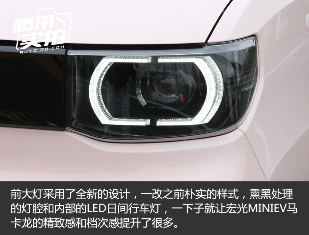 前大灯采用了全新的设计,一改之前朴实的样式,熏黑处理的灯腔和内部的LED日间行车灯,一下子就让宏光MINIEV马卡龙的精致感和档次感提升了很多。