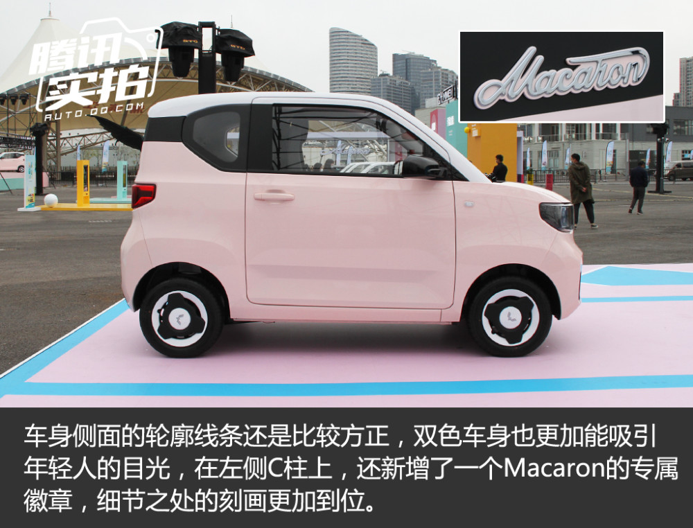 车身侧面的轮廓线条还是比较方正,双色车身也更加能吸引年轻人的目光,在左侧C柱上,还新增了一个Macaron的专属徽章,细节之处的刻画更加到位。