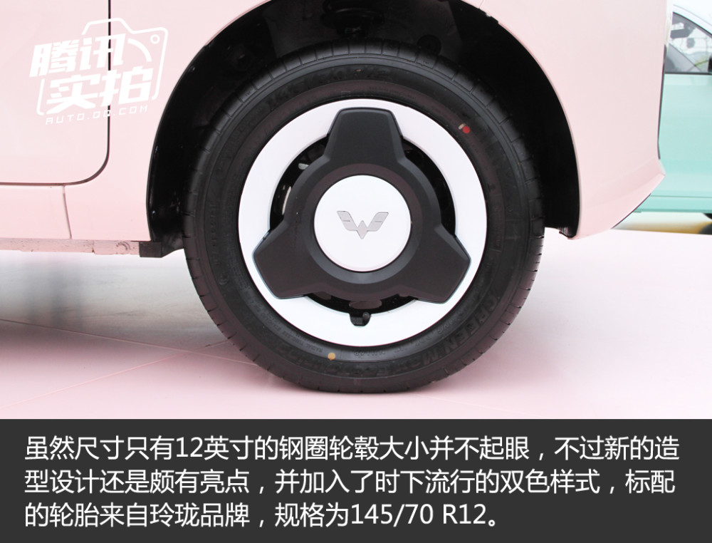 虽然尺寸只有12英寸的钢圈轮毂大小并不起眼,不过新的造型设计还是颇有亮点,并加入了时下流行的双色样式,标配的轮胎来自玲珑品牌,规格为145/70 R12。