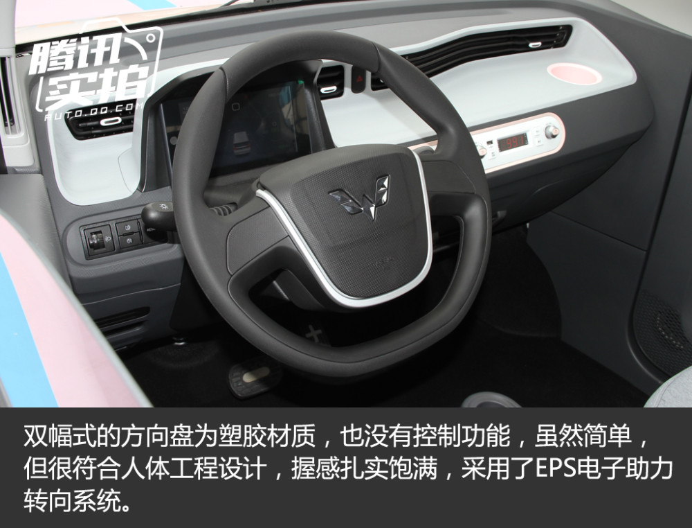 双幅式的方向盘为塑胶材质,也没有控制功能,虽然简单,但很符合人体工程设计,握感扎实饱满,采用了EPS电子助力转向系统。