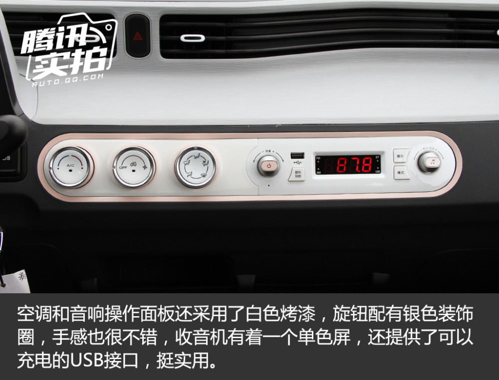 空调和音响操作面板还采用了白色烤漆,旋钮配有银色装饰圈,手感也很不错,收音机有着一个单色屏,还提供了可以充电的USB接口,挺实用。