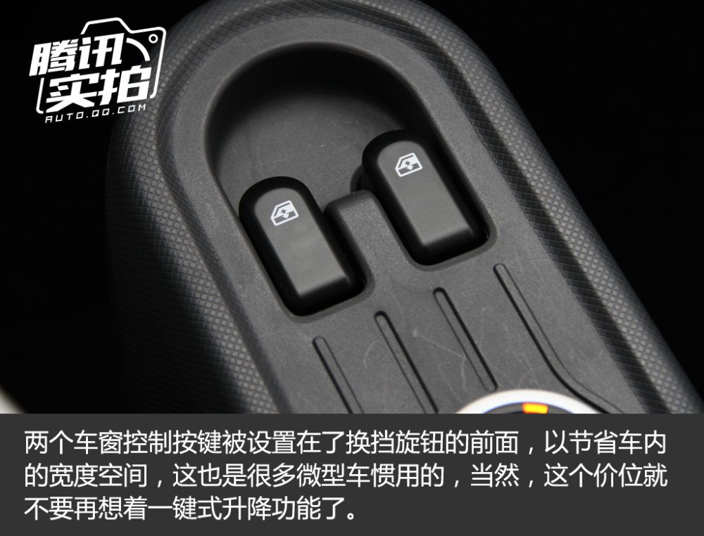 两个车窗控制按键被设置在了换挡旋钮的前面,以节省车内的宽度空间,这也是很多微型车惯用的,当然,这个价位就不要再想着一键式升降功能了。