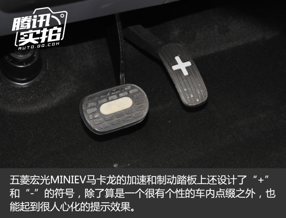 五菱宏光MINIEV马卡龙的加速和制动踏板上还设计了“+”和“-”的符号,除了算是一个很有个性的车内点缀之外,也能起到很人心化的提示效果。