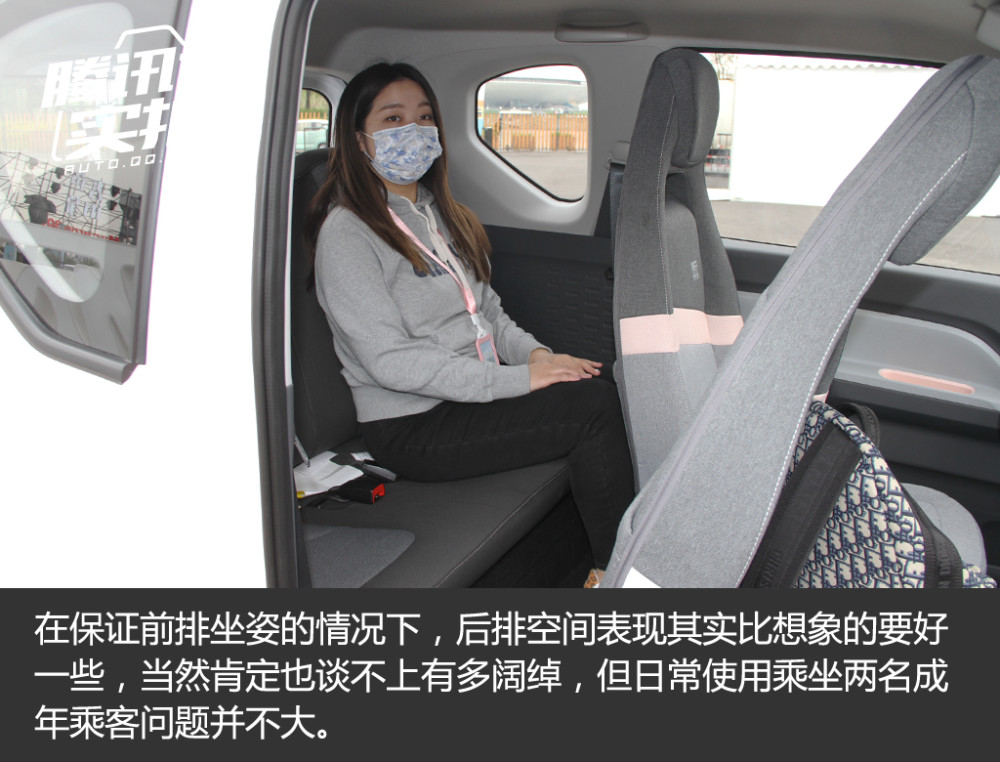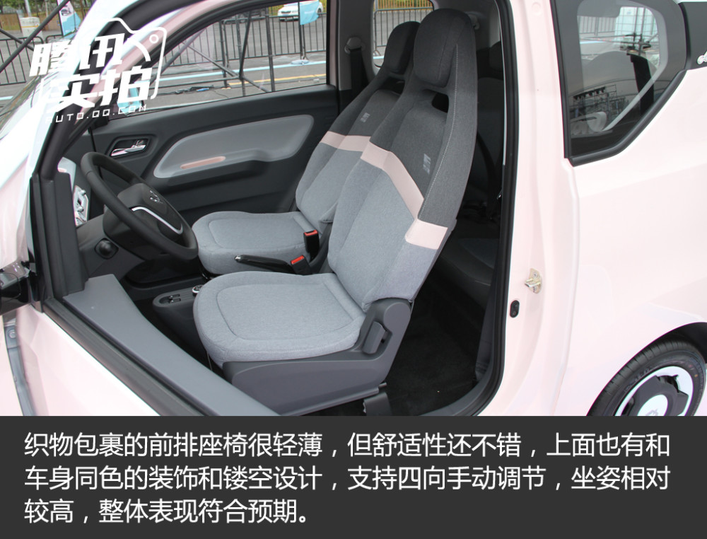 织物包裹的前排座椅很轻薄,但舒适性还不错,上面也有和车身同色的装饰和镂空设计,支持四向手动调节,坐姿相对较高,整体表现符合预期。