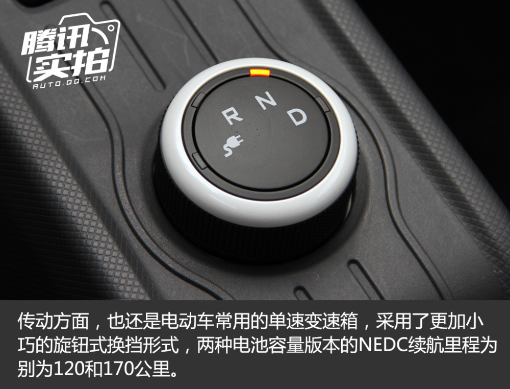 传动方面,也还是电动车常用的单速变速箱,采用了更加小巧的旋钮式换挡形式,两种电池容量版本的NEDC续航里程为别为120和170公里。