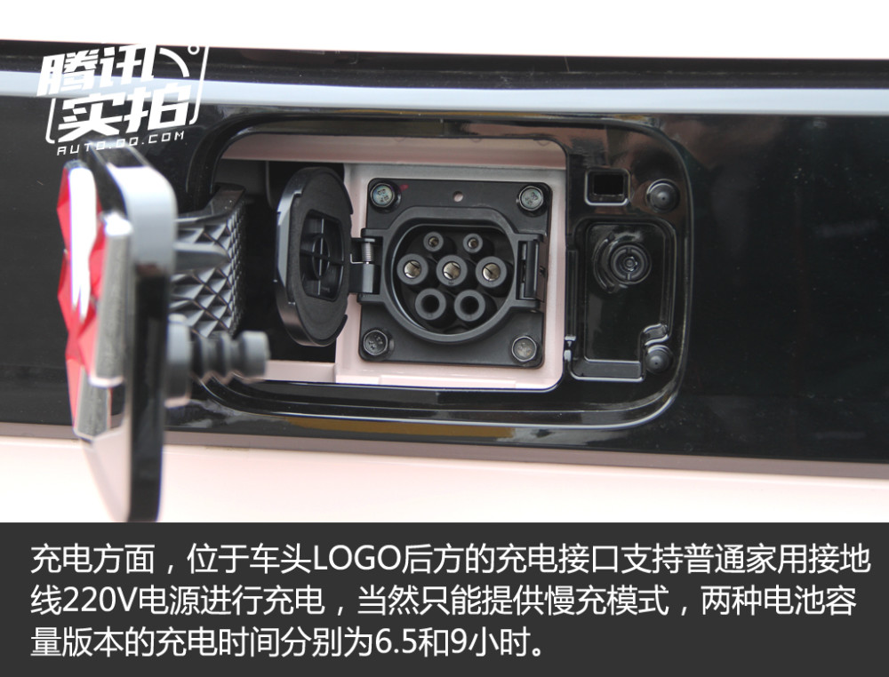 充电方面,位于车头LOGO后方的充电接口支持普通家用接地线220V电源进行充电,当然只能提供慢充模式,两种电池容量版本的充电时间分别为6.5和9小时。